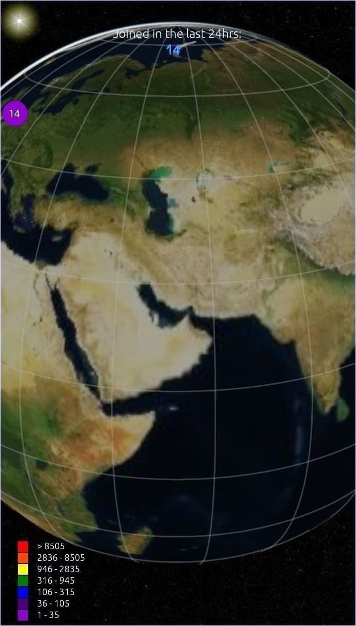 To visualize the partecipation of the Community on the Earth's surface, is employ a geographical grid system composed of 288 cells, formed by intersection of 24 meridians and 12 parallels. Each cell's placeholder, situated at its center, displays the total number of Joins made within its geographical area. Depending on the total count, the placeholder may assume different colors. (A reference table is exposed in lower-left corner.)