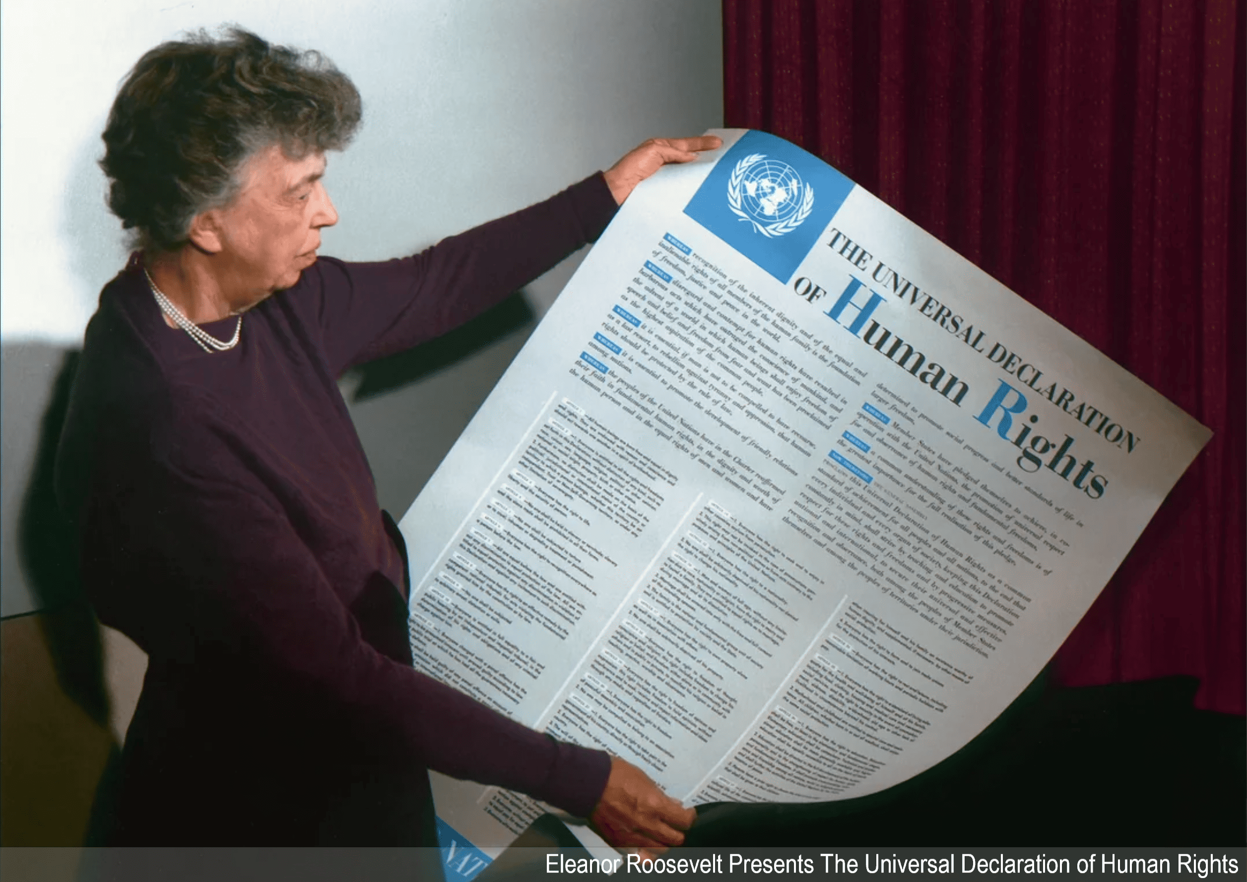 On World Invocation Day, 1952, Eleanor Roosevelt, a pioneering force in the passage of the Declaration of Human Rights at the United Nations, and wife of President Franklin D. Roosevelt, recorded a brief message which included the Great Invocation. The message was recorded by Mrs Roosevelt at the United Nations: