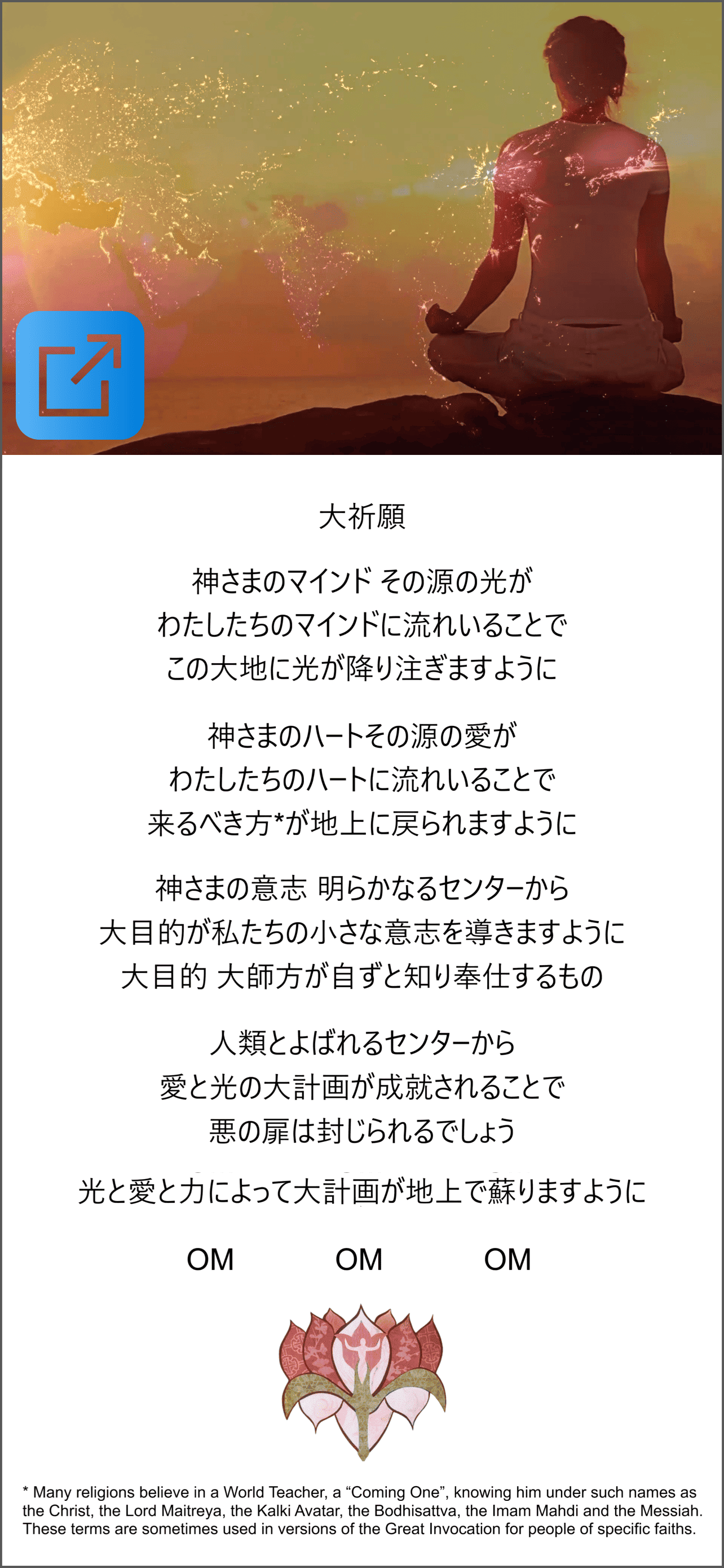 * Many religions believe in a World Teacher, a "Coming One", knowing him under such names as the Christ, the Lord Maitreya, the Kalki Avatar, the Bodhisattva, the Imam Mahdi and the Messiah. These terms are sometimes used in versions of the Great Invocation for people of specific faiths.